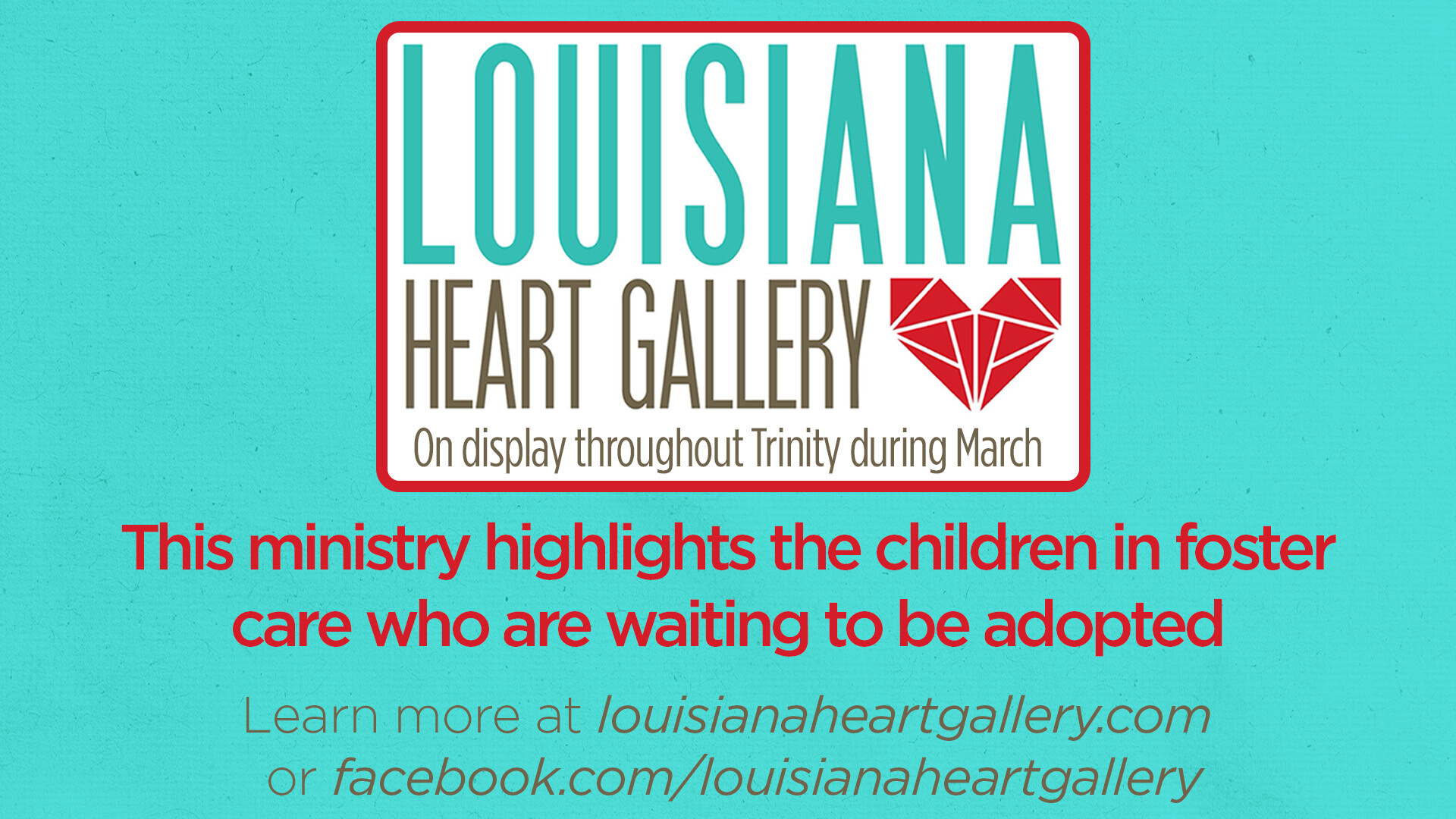 The Louisiana Heart GalleryMarch 8, 2026This ministry highlights children in Foster Care waiting to be adopted. The gallery will be up in various places around...