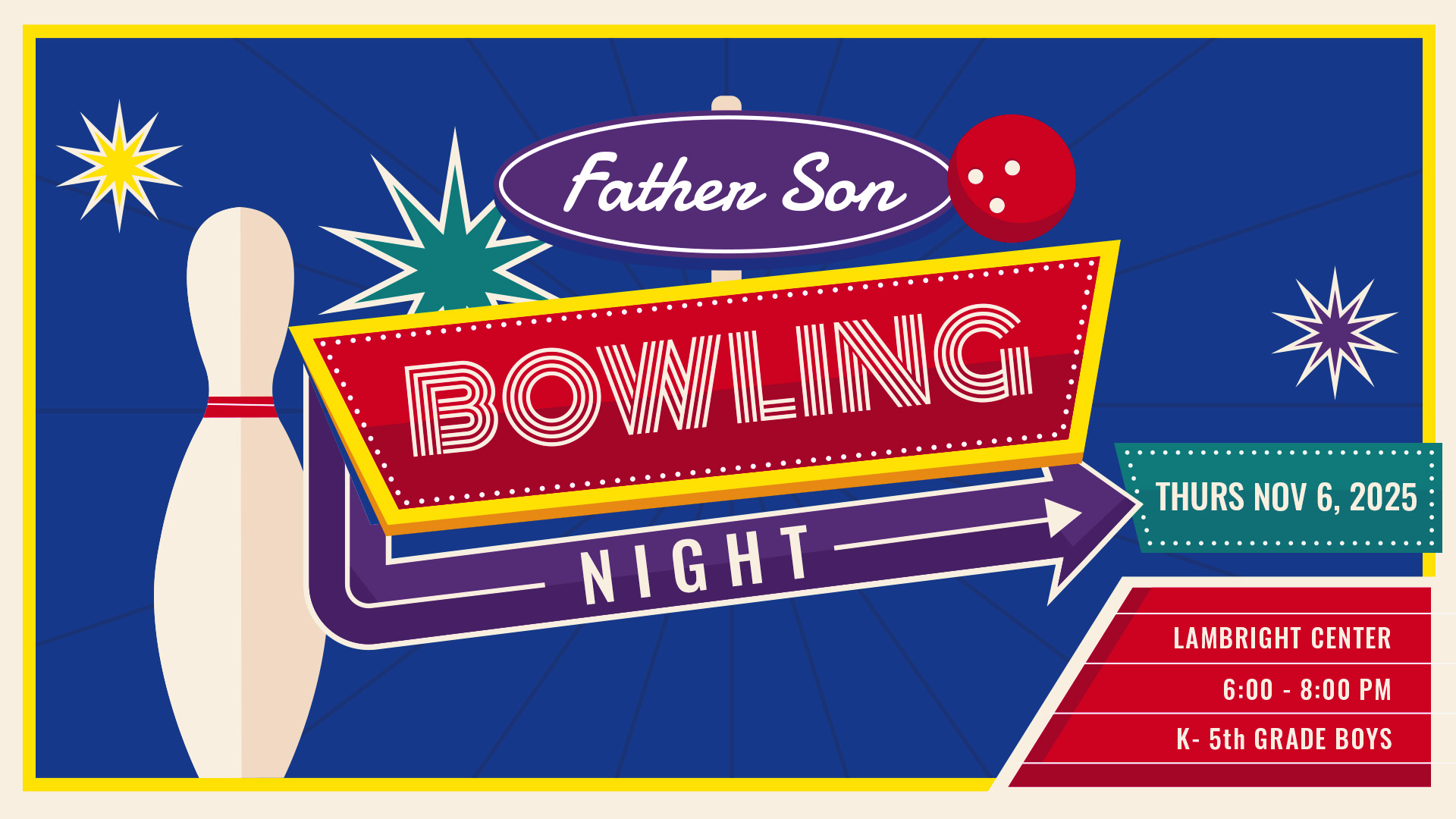 Dads and sons (Kindergarten–5th grade) — you’re invited to an unforgettable night of bowling, pizza, and great fellowship! Join us Thursday, November 6th, from 6–8 PM at the Louisiana Tech Lambright Center for some friendly competition, laughter, and a chance to create lasting memories together.